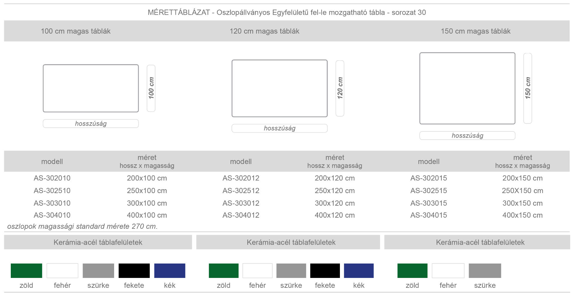 Oszlopállványos, oldalszárnyas tábla, öt írható felülettel. Választható krétás, filctollal írható, vegyes felülettel, vonalazással. Eloxált alumínium oszlopok magassága: 270 cm