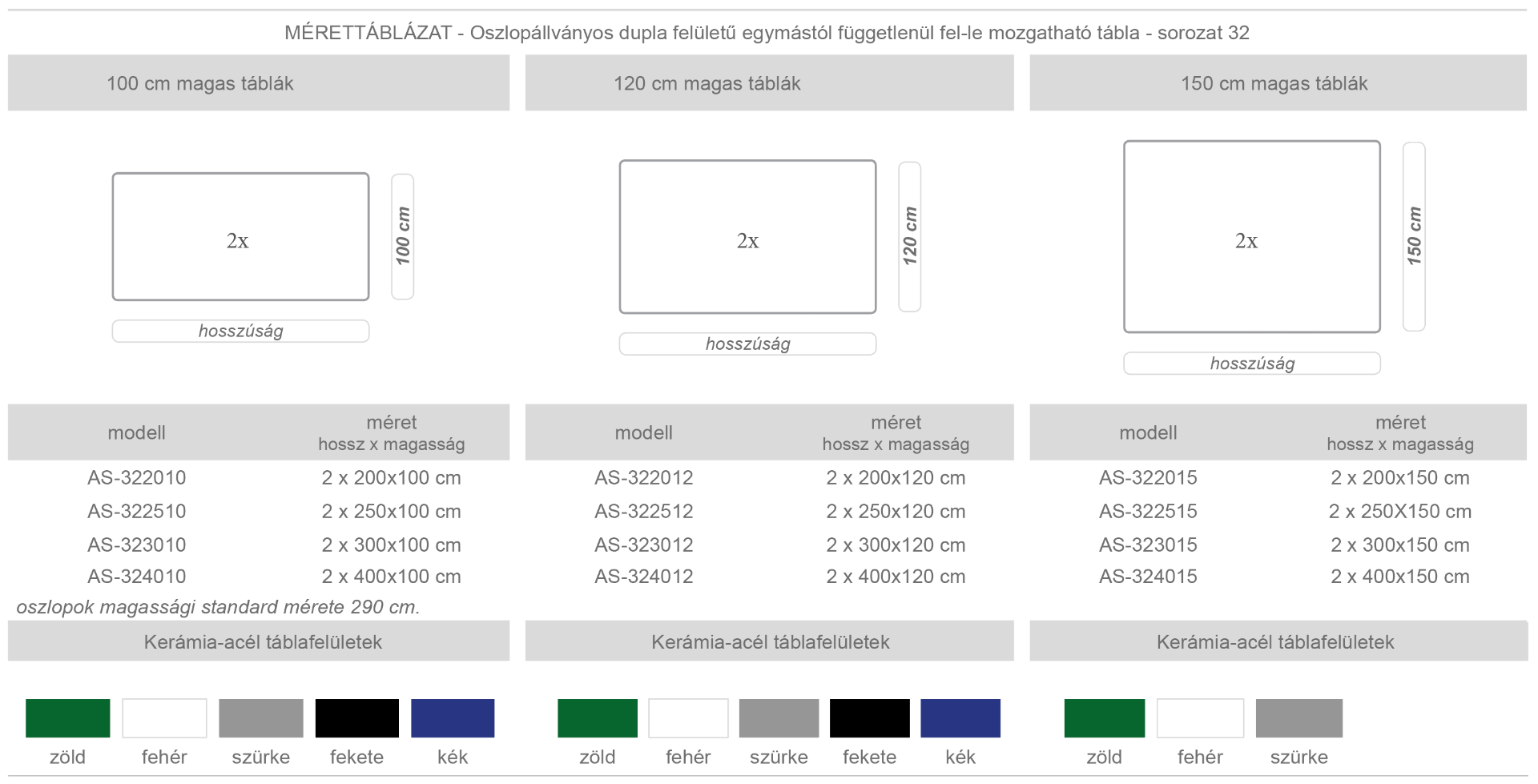 Dupla oszlopállványos, független mozgó tábla, két írható felülettel. Választható krétás, filctollal írható, vegyes felülettel, vonalazással. A táblák tartozéka az eloxált alumínium krétatartó sín, falra szerelhető kis méretű szivacstartó, műanyag sarokelem. Az eloxált alumínium oszlopok magassága: 290 cm.